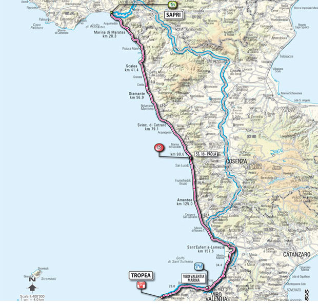 Larga etapa entre las localidades de Sapri y Tropea, al sur de Italia, siendo junto con la etapa de Parma la única jornada llana de la primera semana … aunque con un repecho muy cerca de la llegada que abre el abanico de posibles resoluciones, dificultando la opción de victoria de los sprinters puros.