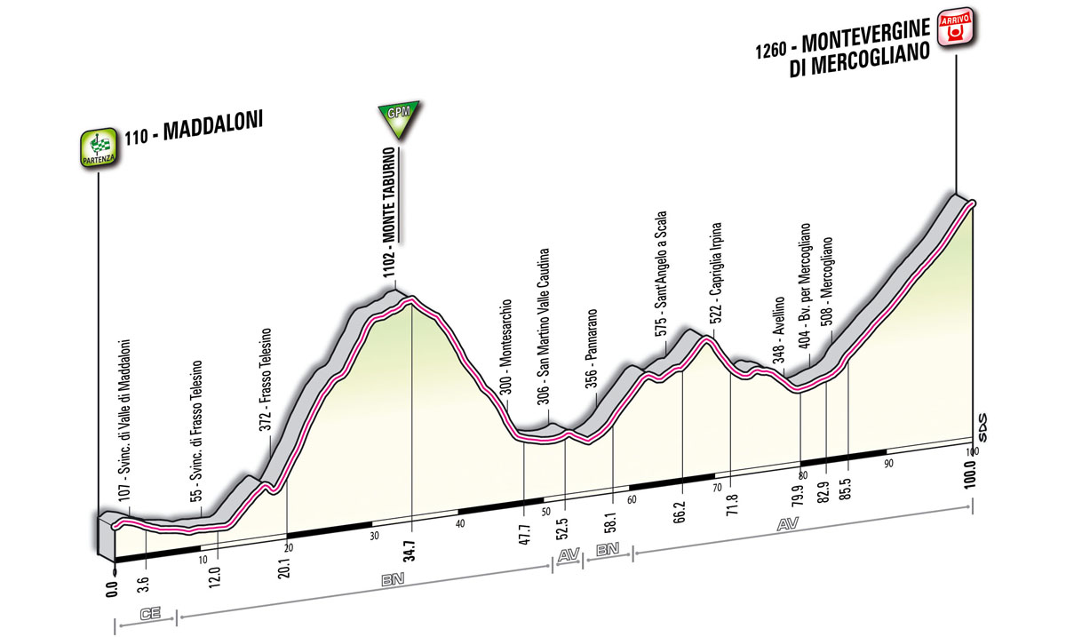 7ª ETAPA (Viernes 13 Mayo): MADDALONI – MONTEVERGINE DI MERCOGLIANO (110 km). Rutómetro / Últimos km