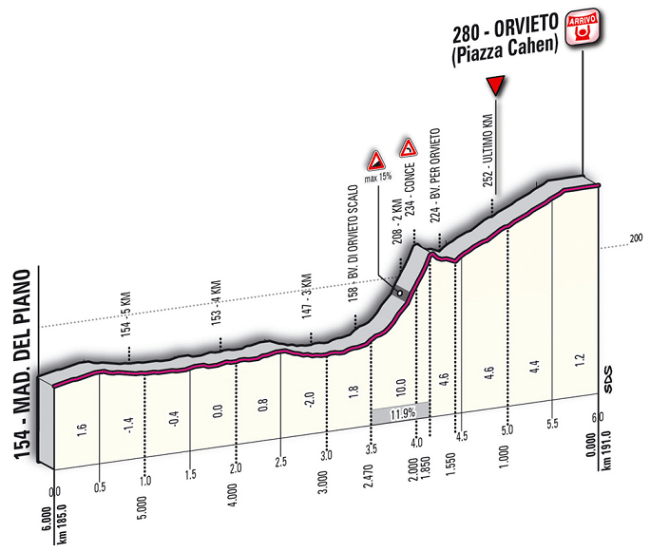Cuando los ciclistas vuelvan a circular por una carretera asfaltada restarán 15 km para la línea de meta, los primeros 12,5 km llanos pero seguidos por el duro repecho de Orvieto, con rampas de hasta el 15%, y un tramo de subida ya más tendido en busca de la Piazza Cahen, con 350 m finales ya sí completamente llanos.
