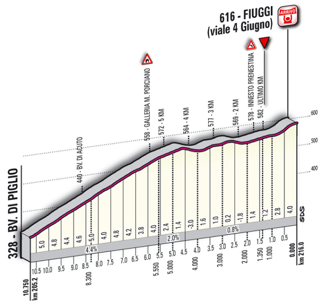 Ya en la parte final del recorrido está la ascensión hacia Fiuggi. No tiene mayor dificultad, sin rampas duras y por buena carretera, con un tramo de 5,2 km al 4,4% al que sigue un falso llano de algo más de 5 km hasta alcanzar la línea de meta, que pica hacia arriba con 500 m al 4 %