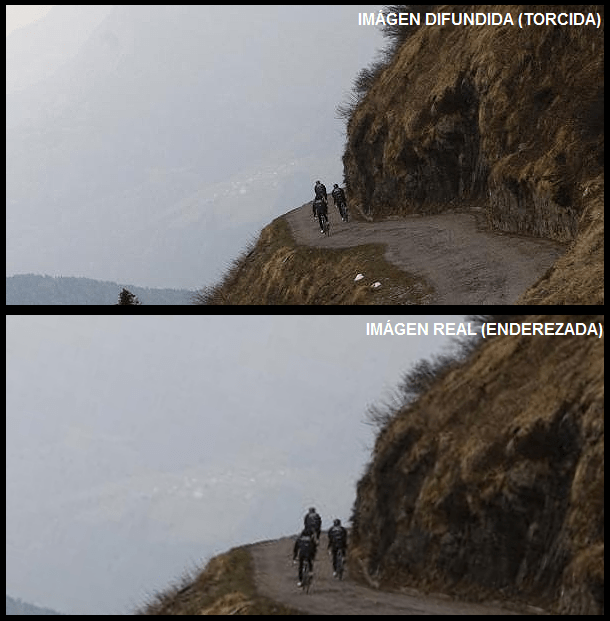 La imagen difundida del Monte Crostis y la imagen real y enderezada, un ejemplo de la desinformación sufrida.
