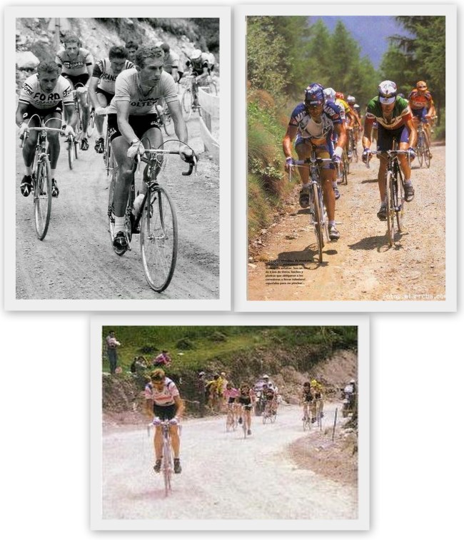 Y de la misma forma que pavés y Tour van de la mano lo hacen los tramos de tierra y el Giro de Italia. Han sido multitud los grandes puertos italianos que se han pasado sin asfaltar, tanto en subida como también en bajada. Como ejemplos de los que tengamos certeza, está el Passo di Gavia, que la última vez que se subió sin asfalto fue ya en 1996. También el Passo Duran se pasó por tierra hasta el Giro de 1988 (el año de la nieve y el barro en el infierno del Gavia. En 1966 al menos también se bajó de tierra). Y el Monte Grappa en 1982 se pasó en su parte alta por tierra, tanto en subida como en bajada. De hecho la única vez que se subió al Rifuggio Gardeccia (Torri del Vajolet),  en 1976, y que veremos de nuevo este año, fue por pista de tierra.