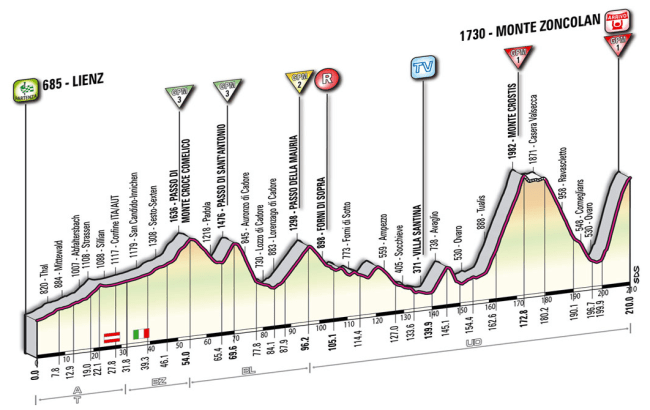 14ª ETAPA (Sábado 21 Mayo):  LIENZ – MONTE ZONCOLAN  (190 km).  Rutómetro