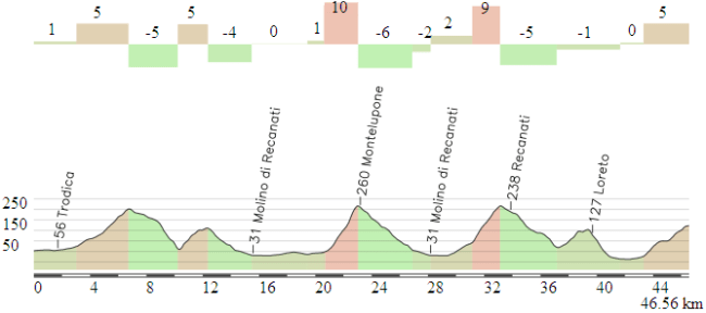 • Recanati, np (km 129,7):  234 m – 3,5 km – 5,8 %
