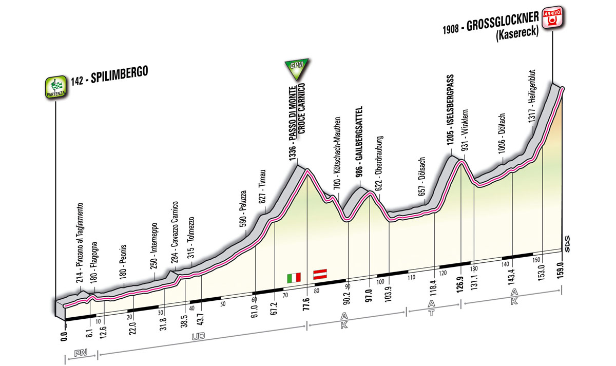 Después de un enorme traslado desde Ravenna, el tríptico alpino se inicia con una etapa de 167 km con salida en Spilimbergo y llegada a los pies del Grossglockner (cota 2.137 m), en los Alpes austríacos, previo paso por Iselberg y la «pared» de Kasereck entre otros puertos.