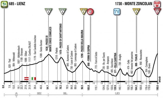 La etapa saldrá de la ciudad Lienz, en territorio austríaco, pero a la altura del km 32 se atravesará la frontera para volver a Italia. Toda esa primera parte del recorrido pica de un modo casi constante hacia arriba, aunque no será hasta poco antes del km 50 cuando se inicie la ascensión al primer puerto del día, el Monte Croce Comelico, que alcanza más de 1.600 m de altura pero cuenta con escasa dureza. Después del descenso (hasta el km 10,8) y con apenas 3 km de llano intermedio se afrontará el Passo di Sant´Antonio, corto pero relativamente exigente: 4 km finales al 6,6 %.