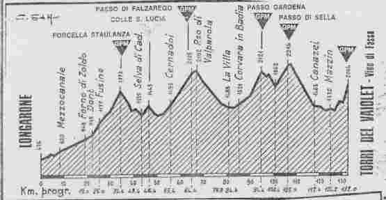 16ª ETAPA (Domingo 21 Mayo):  CONEGLIANO – GARDECCIA/VAL DI FASSA  (229 km).  Rutómetro / Mapa de los puertos / Últimos km