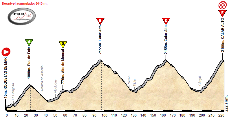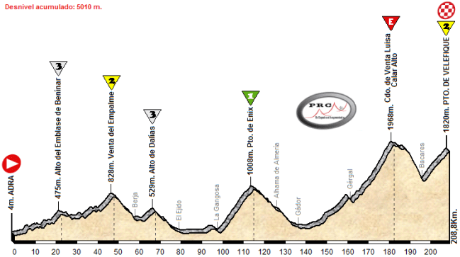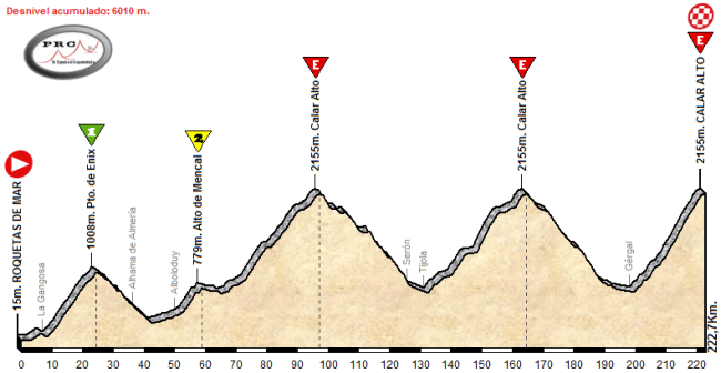 Un primer puerto de mucho desgaste y desnivel, un segundo explosivo y durísimo donde algún kamikaze (pensando en Nibali o Contador, por ejemplo) y, si aquí no se rompe la carrera, todo un puertarraco especial de paso para lanzar el ataque que dé un vuelco a la clasificación general. Bajada muy rápida y tendido ascenso a Velefique por Bacares, que se podría puntuar como 1ª por desgaste acumulado y lugar en la prueba.