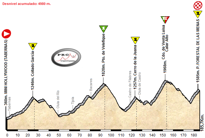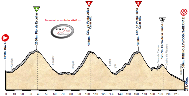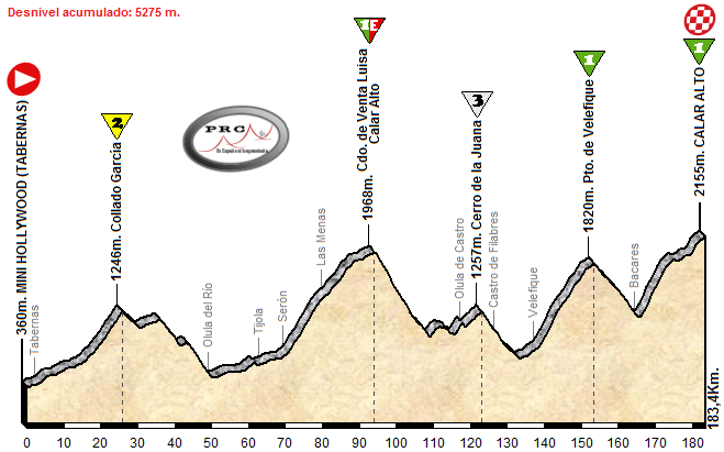 Desde el Parque Temático de Mini Hollywood, en uno de los poblados del Oeste creados para rodar «spaghetti-westerns» en Tabernas, sale esta gran etapa de montaña para subir primero el Collado García (11 Km. al 5,6%) y bajar, con un par de repechos en el camino, hasta Olula del Río. Desde Tijola se comienza a subir, en este caso hacia Bacares para afrontar la vertiente norte del Puerto de Velefique (28,5 Km. al 3,9%), una ascensión larga pero tendida y con descansillos… pero buena para las fugas y como desgaste.