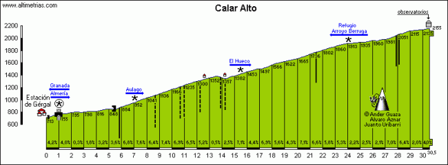 Ya en Gérgal nos queda la guinda del pastel, otro coloso de 22,8 Km. al 6,3% que como mostrábamos antes no le envidia nada a todo un Tourmalet… un ascensión agónica por toda la tralla anterior y donde pueden caer minutos como si fueran segundos. Y es que llegar hasta el Observatorio Astronómico elevará a la categoría de héroe no solo al ganador, sino a cualquiera que finalice semejante etapón.