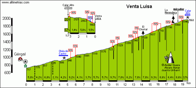 Tras el descenso de Velefique y sus múltiples herraduras se afronta la vertiente dura del Cerro de la Juana, 10,4 Km. al 5,5% pero con rampas de hasta el 17% que darán continuidad la a dureza. La bajada por Olula de Castro esconde varios repechos y es técnica por la estrechez de la carretera, aunque con un asfalto impecable que nos deja por encima de Gérgal, a media subida hacia Venta Luisa. Al no subirse la parte inicial, los datos del Cdo. de Venta Luisa en este caso son unos 14 Km. al 7,2%quedándose por tanto en el límite de la Categoría Especial pudiéndose puntuar perfectamente como un 1ª… pero que hará mucho daño especialmente por el duro encadenado propuesto.