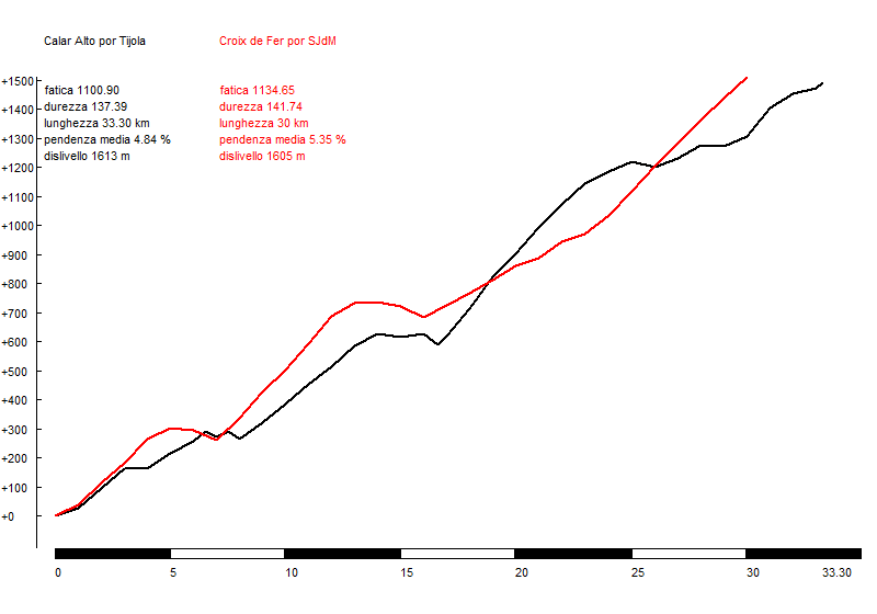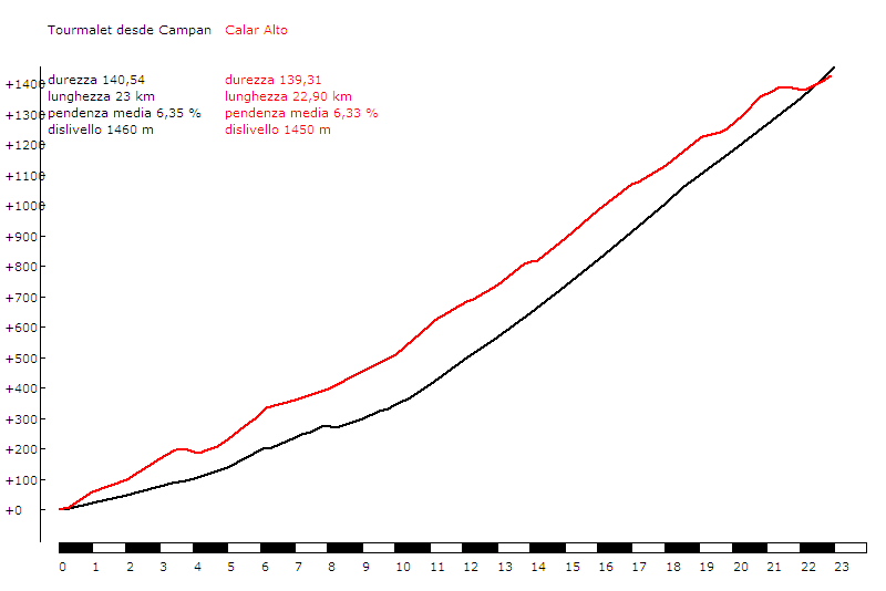 En cuanto a nuestras clásicas comparativas con otros puertos famosos, en este caso solo las haremos de dos vertientes, desde Gérgal y desde Tijola. La primera es impresionante, ya que aguanta el tipo frente al puerto más conocido del mundo, el Tourmalet, por su vertiente de Campan. Para la de Tijola hemos usado otro clásico del Tour, la Croix de Fer por Saint Jean de Maurienne, siendo ambos puertos muy largos e irregulares.