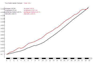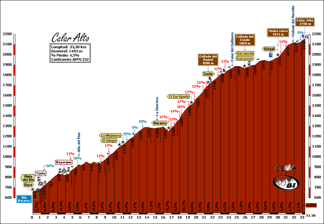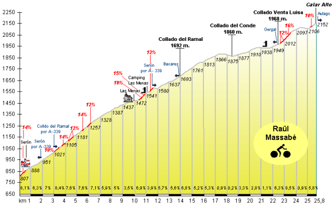 La verdad es que si Calar Alto ya es un puerto muy duro desde el cruce de Gergal, con ese añadido se convierte en un coloso impresionante, con casi 40 km de longitud y alrededor de 2000 m de desnivel acumulado.