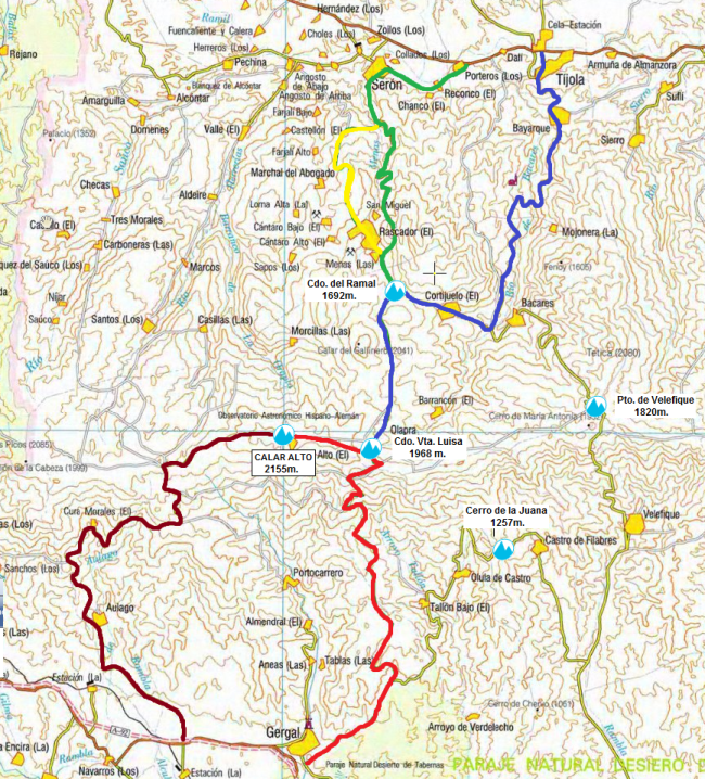 En el siguiente mapa marcamos las 5 formas diferentes de ascender a Calar Alto: