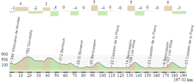 Lo más duro de la crono es la parte inicial, hasta alcanzar el Port del Marianet, un terreno sin grandes rampas pero que pica constantemente hacia arriba: 4-5 km de falso llano ascendente seguidos por 4 km al 5,2 %. Finalizado el suave descenso, en la localidad de Azuébar, se entra en una zona «pestosa», con varios repechos y un trazado que no permitirá un ritmo constante debido a algunas curvas y rotondas. En el km 25, terminado el último repecho de cierta exigencia, se entrará en la Nacional 225, carretera con una clara tendencia favorable y la única dificultad de ser una zona muy abierta, por lo que el viento puede «hacer de las suyas». Ya en las cercanías de La Vall d´Uxió se abandonará esa carretera, para tras un pequeño repecho finalizar la crono en la Avenida del Corazón de Jesús, en el centro de la localidad.