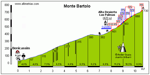 A partir de ahí la ruta continuará en dirección sur hasta llegar a Almazora, localidad donde se cambiará completamente de sentido para dirigirse hacia el norte, tomando la CV-183 y más tarde la CS-22 en busca de El Grao de Castellón. En esa población se cogerá una carretera algo más secundaria (aunque también ancha y en perfectas condiciones) hasta llegar a Benicassim, donde tras una larga travesía urbana se tomará un desvió para afrontar el Desierto Las Palmas, una subida sin grandes rampas pero que cuenta con 4 km centrales al 6,6 % y un trazado muy escénico gracias a varias curvas de herradura. Después de un primer altillo hay una zona más o menos llana antes de encarar los 800 m finales de ascensión.