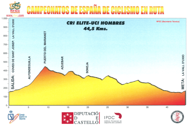 La prueba contrarreloj para los profesionales consta de 44,5 km de recorrido entre Coves de Sant Josep y La Vall d´Uxió, localidad perteneciente a la Plana Baja, en la zona sur de Castellón, y que cuenta con alrededor de 30.000 habitantes.