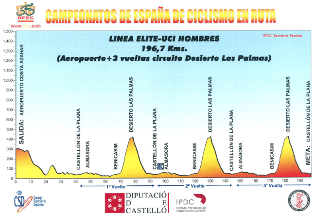 Más allá del kilometraje real, se trata de un circuito llamativo y que puede dar mucho juego gracias a la inclusión del Desierto Las Palmas … aunque el trazado «facilón» que hay antes y después, llano y casi siempre por carreteras principales, lo desluce bastante, haciendo que sea propicio para los reagrupamientos. Salvo que haya ataques muy fuertes en el puerto, es probable que la carrera se resuelva mediante un sprint reducido, aunque tampoco es descartable que pueda triunfar una escapada si nadie asume la responsabilidad en el pelotón.