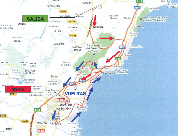 La prueba en línea saldrá desde el Aeropuerto Costa Azahar, al norte de Castellón de La Plana, y terminará en la propia capital castellonense despues de 197 km de recorrido, la mayoría de ellos pertenecientes a un circuito que se realizará en 3 ocasiones y que incluye el Desierto Las Palmas como principal dificultad, coronándose a 15 km de meta en el último paso de acuerdo al rutómetro.