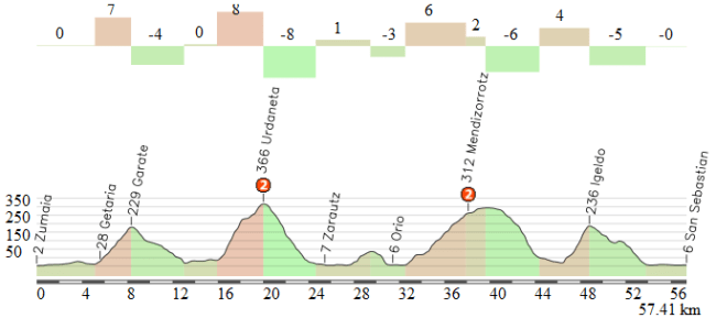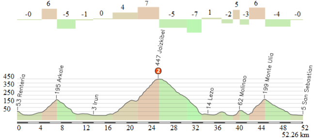 - Jaizkibel => Long: 8,2km; Desnivel: 440m; % Medio:5,37% (se pasa en dos ocasiones (kilómetros 157 y 196,2))