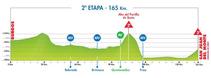 Una jornada inaugural “explosiva”, sin mucho kilometraje pero con una subida final de buenas rampas que marcará las primeras diferencias entre los favoritos (aunque de pocos segundos), siendo una etapa muy propicia para los up-hill finishers, especialistas de las llegadas en repecho … y que en esta Vuelta a Burgos se pueden “inflar”, ya que a priori van a tener 3 oportunidades claras de victoria en sólo 5 etapas. Eso si, en este caso y de acuerdo a las primeras noticias que se publicaron sobre el recorrido, parece ser que la intención inicial de las organizadores era acabar esta jornada en las propias calles de Miranda de Ebro, pero al final se terminará en el alto.