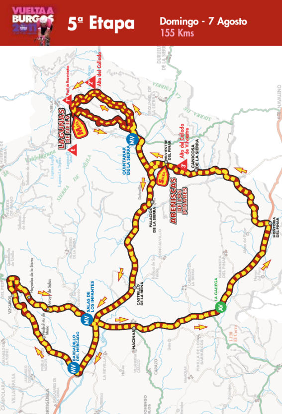 Como viene sucediendo desde el año 2009, la Vuelta a Burgos se despide con la etapa reina: una jornada de sólo 155 km pero que incluye un doble paso por las Lagunas de Neila (aunque el primero sólo hasta la cota 1717 metros) aparte de otras ascensiones más modestas, como Vilviestre y un doble paso por El Collado.