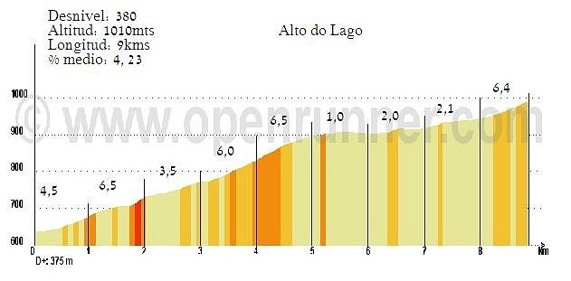 Una vez en la cima hay un tendido descenso hacia la localidad de Becerrea, donde tras girar hacia el norte y sin un km llano comienza la subida al segundo puerto de la jornada: el Alto de O Lago, que cuenta con un primer tramo de 5 km a casi el 5,5 % de media, dando paso a una zona de falso llano seguida por un último km de nuevo con cierta exigencia. Después de coronar hay una corta bajada antes del inicio de la subida a O Picato-Cruz de Restelo, una ascensión que pese a a no estar marcada como puerto tiene dureza suficiente para ser considerada un 3ª: 4 km al 5 % de media … y un tramo de 1 km al 10 % cerca de la cima. Una vez alcanzada la cota más alta, O Picato, medio km de suave bajada hasta llegar a Cruz de Restelo, donde se girará hacia la derecha para realizar un fuerte descenso de 10 km en busca de Navia de Suarna, localidad situada junto al Río Navia.