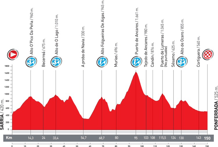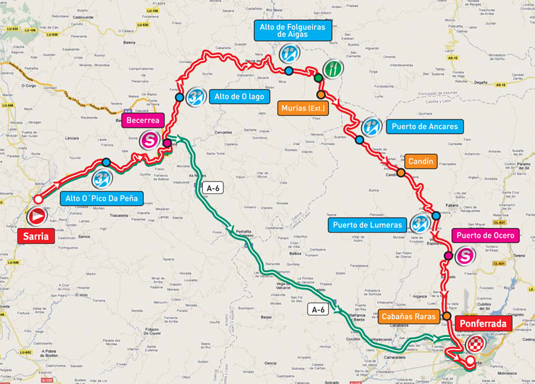 El decisivo tríptico del fin de semana se inicia con un dura y novedosa etapa de montaña con salida en Sarria, en la provincia de Lugo, y final en la localidad berciana de Ponferrada, en la provincia de León, tras un recorrido que incluye el inédito Puerto de Ancares como mayor dificultad, aunque a más de 60 km de meta, siendo los últimos 20 prácticamente llanos y por buena carretera.