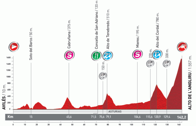 15ª ETAPA (Domingo 4 Septiembre): AVILÉS – ALTO DE L´ANGLIRU (142,2 km). Rutómetro / Últimos km