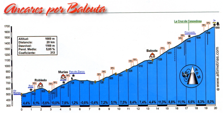 En la parte positiva, es una gran noticia que por fin se estrene Ancares (asfaltado desde hace más de 30 años!) y en general toda la sierra del mismo nombre en la Vuelta a España, siendo una zona con enormes posibilidades para el ciclismo, tanto a nivel profesional como cicloturista, además de tener paisajes preciosos, en plena naturaleza. Y no faltan «puertacos» … de hecho la vertiente que se va a subir de Ancares no es la más dura, honor que recae en el «muro» de Pan do Zarco: 12 km al 9,2% de media (sin contar el repecho inicial hasta Robledo) y con un durísimo tramo central de 5,7 km al 11,7 % y puntas del 20 %.