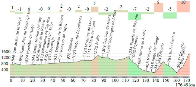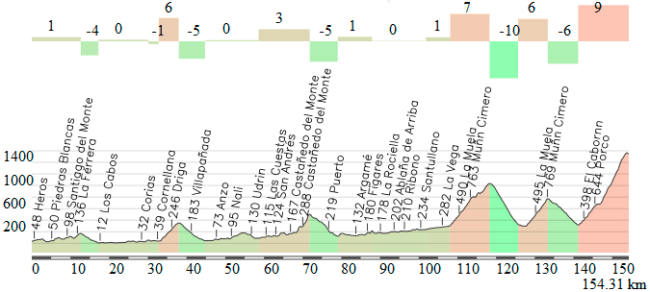 Una etapa a priori decisiva, con escaso kilometraje y tampoco mucho desnivel acumulado pero una subida final tan dura que por si sola puede marcar grandes diferencias entre los favoritos, aunque será clave el ritmo que haya durante la ascensión previa al Cordal. Y cuidado con su peligroso descenso, sobre todo si llueve.