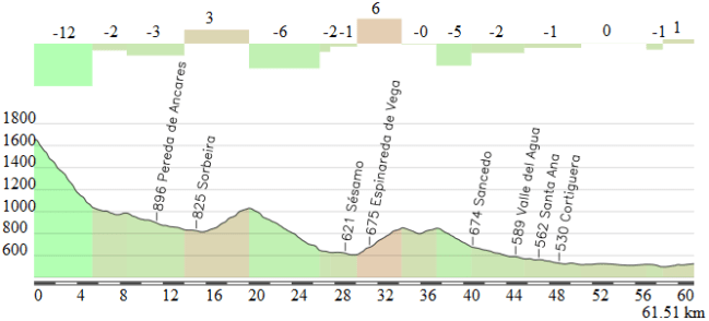 La primera mitad de la etapa, sin grandes puertos pero con un recorrido "serrucho" que incluye Fumaces, Herosa, Gonza, Meda y Portela.