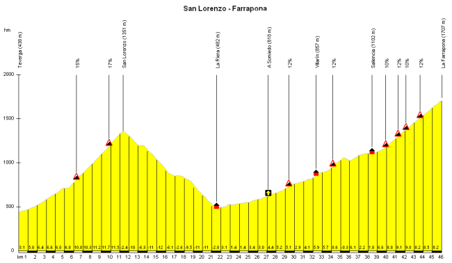 Finalizado el descenso hay un tramo de falso llano ascendente (desde La Riera al km 5,5) hasta que al tomar un desvío hacia la izquierda de comienzo la auténtica ascensión a La Farrapona, con unas cifras totales muy serias, 18 km al 5,8 %, pero que no aclaran su verderara exigencia. Y es que al igual que en el caso de San Lorenzo la subida se puede dividir en varias partes, con 12 km iniciales sin grandes dificultades (a excepción de rampas aisladas y un tramo de 1,5 km por encima del 8 %), incluyendo una pequeña bajada intermedia … pero con una parte final muy dura, siendo los últimos 6,5 km muy constantes al 8-9 %. Una ascensión muy «pajarera» y donde si el ritmo durante la etapa ha sido elevado se podría ver más de un hundimiento en los km finales. En este otro perfil se pueden ver los % cada 500 m -> perfil detallado (incluye fotos)
