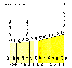 La primera mitad del recorrido es en general bastante llana, con las únicas subidas reseñables al pueblo de San Feliz de las Lavanderas (5,9 km al 3 %, aunque sería superior si no fuera por un descenso intermedio) y al embalse de Los Barrios de Luna (3,8 km al 3,4 %). Pero al llegar a la población de San Emiliano, en el km 97 de la etapa, el terreno empieza a picar hacia arriba en busca de la primera ascensión puntuable de la jornada, el Puerto de Ventana. Eso sí, aunque está catalogado de 2ª, con 6 km al 4,8 % de media no pasa de ser un 3ª, siendo lo más destacable su altitud: casi 1.600 m.