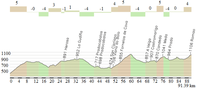 Nada más empezar la etapa los corredores tendrán que afrontar la primera subida puntuable, el Alto de Fumaces, cuyas cifras totales serían 11 km al 4,4 % pero que debido al recorrido neutralizado entre Verín y el la salida real se quedan en 8,1 km al 4,8 %. Una subida modesta pero donde probablemente se produzcan múltiples intentos de fuga, elevando el ritmo del pelotón y pudiendo hacer más daño de lo normal. Después de coronar hay varios km de falsos llanos antes llegar a Vendas da Barreira e iniciar una corta bajada en busca de Navallos y el viaducto do Mente, inicio del Alto de Herosa. Es una ascensión muy irregular, con un descenso intermedio que deja la pendiente en apenas un 3,2 % para 6 km … pero que con un tramo final de 3 km al 5,5 % se podría haber marcado como un puerto de 3ª.