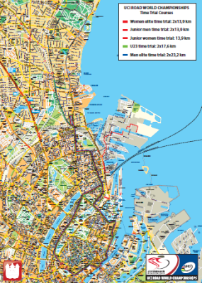 El miércoles 21 se disputa la prueba contra el crono élite masculina, con un recorrido de 46,4 km que consiste en 2 vueltas a un circuito llano de 23,2 km en la ciudad de Copenhague y sin mayor dificultad que el largo kilometraje, ya que a pesar de algunas curvas cerradas la mayor parte del trazado es bastante rectilíneo.