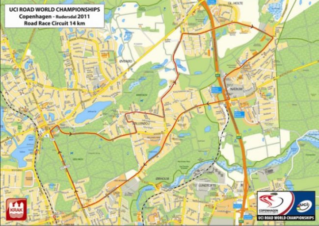 Hay que aclarar que si bien la sede oficial de los Mundiales 2011 es Copenhague, todas las pruebas en línea se realizan en un circuito por las calles de Rudersdal: un municipio de unos 50.000 habitantes situado 20 km al norte de la capital danesa. Es algo similar a lo que sucedía el año pasado en los Mundiales de Melbourne (Australia), con todas las competiciones terminando en la cercana localidad de Geelong.