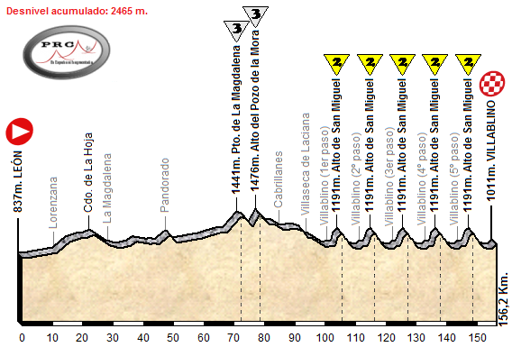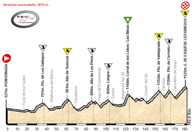 Tras salir de Ponferrada el primer escollo llega en el Km. 29, dando comienzo el Puerto de los Gallegos que no reviste más dificultad que sus primeros 3 Km. al 6,4%. Tras bajar a Villafranca del Bierzo se llega al primer puerto de 2ª, el Alto de Somoza, que ya cuenta con varias rampas por encima del 10% y un kilómetro inicial al 10,2%. Tras pasar Cacabelos llegan los casi 13 Km. del Alto de los Pinos, que son siempre muy tendidos salvo por alguna zona puntual. Se pasa el pequeño repecho de Ocero y desde Vega de Espinareda se vuelve a subir por Berlanga del Bierzo hasta Langre, completando así un poker de subidas modestas que dotan a los primeros 100 Km. de etapa de dureza y oportunidades para las escapadas.