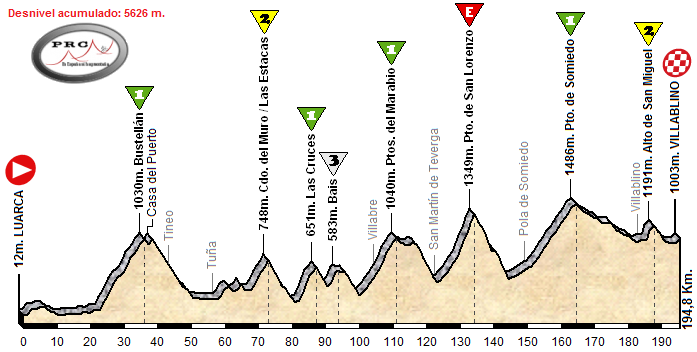 Primera etapa que sale de Asturias y que discurre casi por completo por esta comunidad, algo que se puede adivinar fácilmente contemplando su perfil, con 8 puertos de montaña y casi 5500 m. de desnivel acumulado. Y pese a su gran dureza, no se trata de una etapa típica de alta montaña con varios puertos largos y continuos, sino una mezcla entre eso y la media montaña con constantes subidas, bajadas y puertos cortos y empinados.