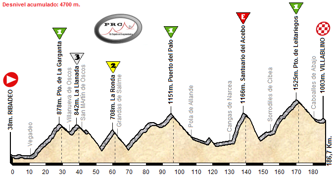 Aunque con menos desnivel acumulado que la etapa anterior, esta etapa con salida en Ribadeo si la podemos considerar de alta montaña, y es que ya cuenta con 3 largos puertos de primera y uno de Especial, además de muchos puertos novedosos por el occidente asturiano y vertientes desconocidas y muy duras de dos puertos clásicos como el Santuario del Acebo y Leitariegos.