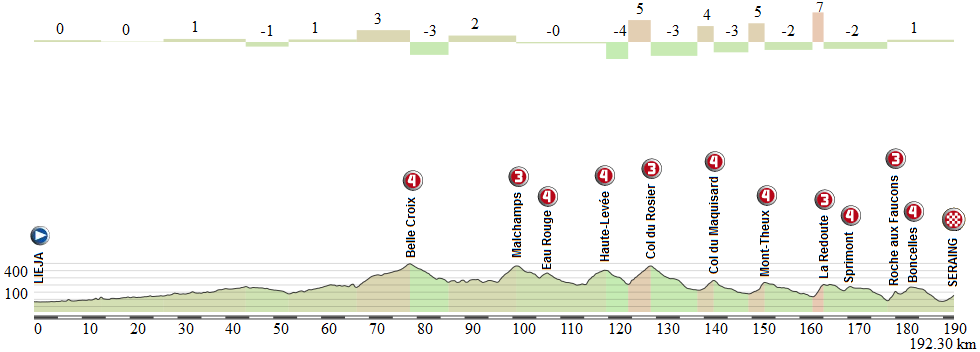 Los primeros 65 km son llanos, pero desde ese momento se suceden hasta 11 cotas antes de la meta. Las tres primeras son la tendida subida a Belle Croix, luego se encara la cota de Malchamps para así entrar en el circuito de Spa Francorchamps y subir por su mítica curva de Eau Rouge y la recta de Kemmel. Desde ese momento se afronta el mismo recorrido que en la Lieja 2011, con la preciosa sucesión de Haute-Levée, Rosier, Maquisard, Mont-Theux (lugar del famoso ataque de Indurain en la etapa de Lieja del 95), la mítica Redoute, Sprimont, la Roca de los Halcones (el nuevo juez de la carrera) y su continuación por Boncelles.