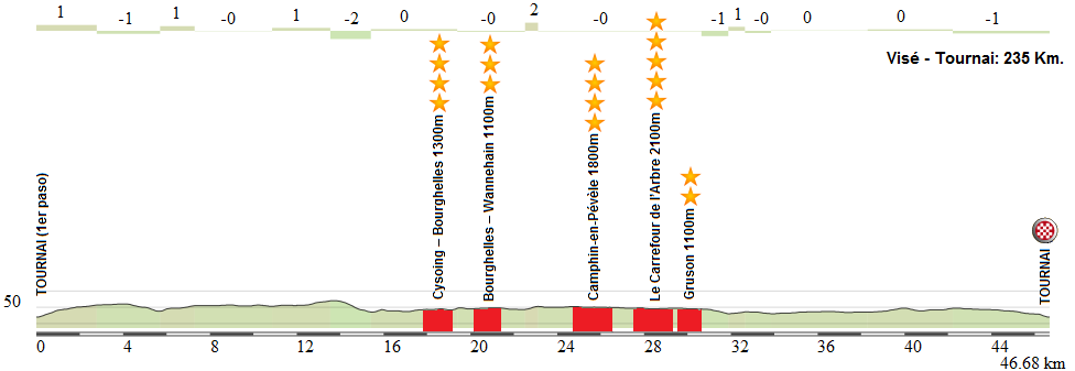 Primero se va lo más rapidamente posible desde Visé a Tournai, para allí comenzar un bucle final de 46 Km. entrando en Francia para afrontar una sucesión de tramos de pavés de lo mejorcito de la mítica Roubaix, incluyendo el «cinco estrellas» del Carrefour de l’Abre. Así, tras llegar a Cysoing la carrera entra en 13 km, de los cuales 7,4 km son de duro empedrado.