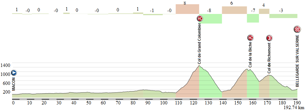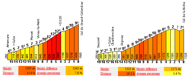 Y es una pena, porque como vemos se podría haber diseñado una gran etapa de media montaña con final en alto, tal y como ocurre en nuestro ejemplo con 7 puertos de montaña, algunos con rampas muy duras. Destaca sin duda la inclusión del Col de Chévrères, pues cuenta con 3 km al 10,3% y se enlazaría perfectamente con el final, consiguiendo así una dupla de puertos cortos pero rompedores para decidir la etapa.