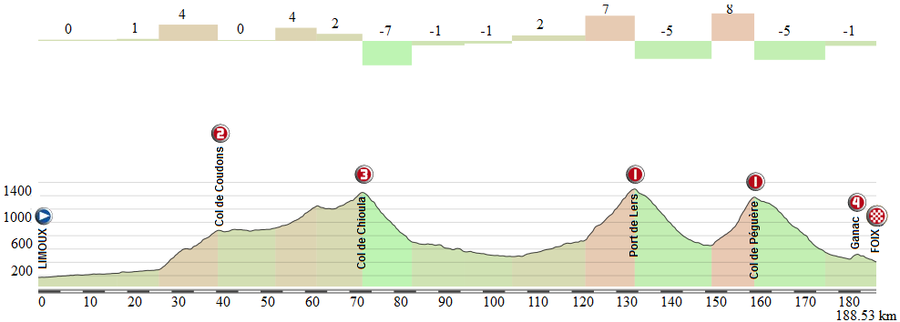 Hemos introducido algo más de dureza inicial, subiendo el Col de Coudons entero y continuando por el tendido Col de Chioula, siendo un buen terreno para la formación de escapadas. Se podría incluir el durísimo Col de Pailheres en su lugar, pero no lo vemos necesario.