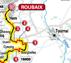 Primero se afronta el tramo doble nº 6, de Cysiong a Bourghelles y de Bourghelles a Wannehain de 4 y 3 estrellas respectivamente. Poco después otro duro tramo de 4 estrellas como el de Camphin-en-Pévèle, «aperitivo» del tremendo Carrefour de l’Abre. Se sale de este tramo para finalizar con el de Gruson, de solo 2 estrellas ya que posee asfalto (aunque muy descarnado) a ambos lados de las piedras en buena parte del tramo. Por cierto, este tramo de Gruson se pasó en la etapa con pavés del Tour 2004.