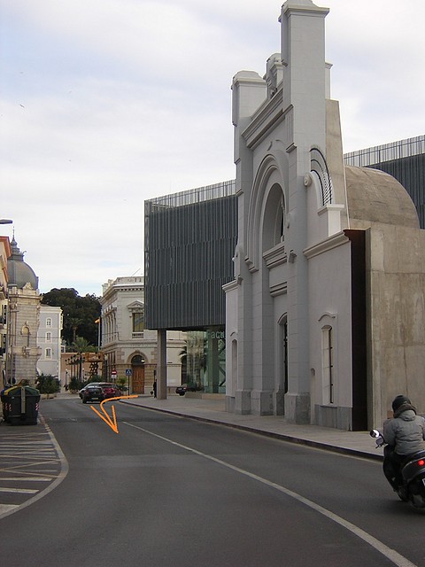 Giro desde la calle Pescadería a la calle Real. A la derecha el antiguo Cuartel de Infantería de Marina.