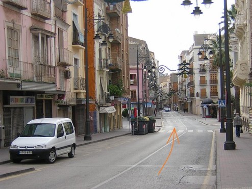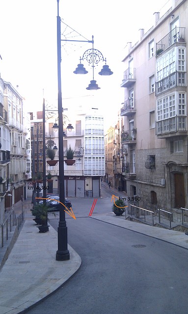 Así, la plaza de San Ginés sería el segundo punto donde se cruzarían los corredores. En la foto no se aprecia bien la anchura que hay debido a los vehículos estacionados: no es muy holgada, pero creemos que suficiente si se toman las debidas precauciones, instalando unas barreras de protección acolchadas para mayor seguridad. Es la curva  más complicada de todo el trazado. Podemos decir que en este punto comienza una fase del recorrido más nerviosa, en la que los ciclistas más hábiles y con mejor arrancada podrán ganar tiempo, ya que hasta ahora han sido largas rectas  llanas donde los más potentes partían con ventaja. Pensando en otras disciplinas, podemos decir que se pasa de un recorrido adecuado a “persecucionistas” a uno bueno para “ciclocrossistas”.