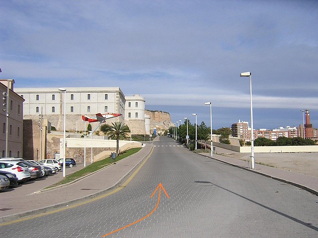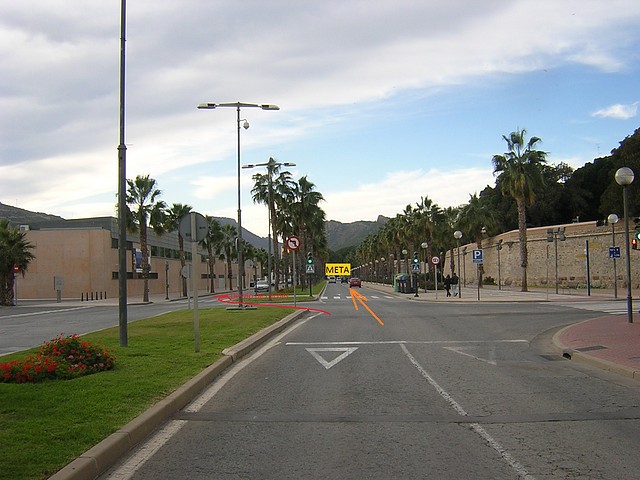 Recta de meta. A la derecha la Muralla de Carlos III y a la izquierda el Museo Nacional de Arqueología Subacuática. Se indica el desvío de coches sugerido.