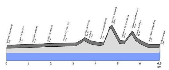 El teatro y la práctica totalidad de los monumentos se mostrarían en este recorrido de 6,900 km. En primer lugar, según nuestra costumbre elaboramos el recorrido con la página web tracks4bikers. Tras comprobar que los datos altimétricos resultantes, de la cartografía Google, no eran correctos, hemos elaborado el perfil definitivo a partir de la cartografía suministrada por el servicio cartomur, resultando mucho más fiable e incluso, si no se cuenta con un buen equipo, más fiable que la toma de datos “in situ”.