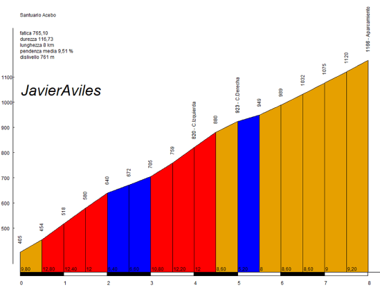 He leído en varios lugares la discusión sobre qué es el «Áprica español», y entre unas sugerencias habituales de Lumeras o incluso Pola de Somiedo, siempre me pienso en Leitariegos norte con el Santuario del Acebo como «Mortirolo». Es que claramente Acebo no tiene la dureza en sí del Mortirolo, pero es tan duro y empinado que seguramente siempre provocaría diferencias importantes. Y lo bueno es que mientras Leitariegos norte es bastante más duro que Aprica, no es tanto duro que los favoritos no pensarían de atacar en Acebo, dandose la oportunidad de diferencias incluso más grandes.